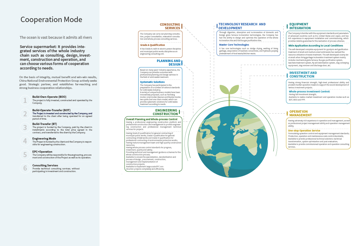 China Energy Conservation and Environmental Protection Group (CECEP) is a flagship enterprise in China, recognized for its large scale, comprehensive specialities, and strong capabilities in the field of energy conservation and environmental protection. The main business areas of CECEP encompass energy conservation and environmental protection, renewable energy, advanced materials, healthcare, and related services. After years of development, CECEP has established unique professional advantages and is at the forefront of the industry in areas such as: Solid waste treatment, Water pollution prevention and control, Air pollution prevention and control, Soil remediation, Clean energy development and utilization, Health industry, Industrial energy conservation, Building energy conservation. CECEP provides customers with comprehensive solutions for energy conservation and environmental protection, offering integrated services that include design, consulting, engineering, construction, technology research and development, equipment manufacturing, project investment, construction and operation management.